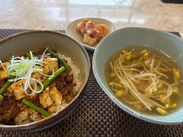 ランチは、麻婆豆腐と牛のスープでした。個人的には豆もやしが高得点。