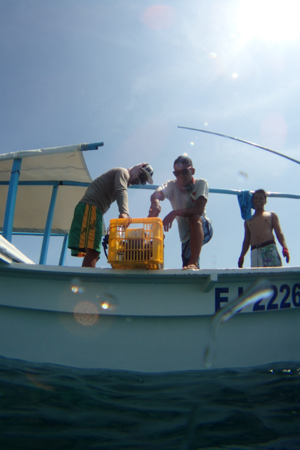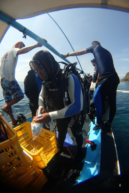 - Boat men transfers them from basket to cement sacks. クレートからセメント袋にオニヒトデを入れ替えるボートマン。