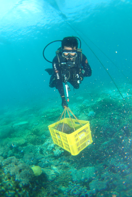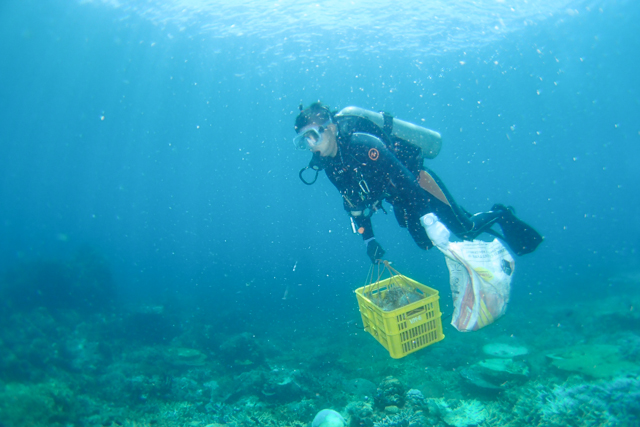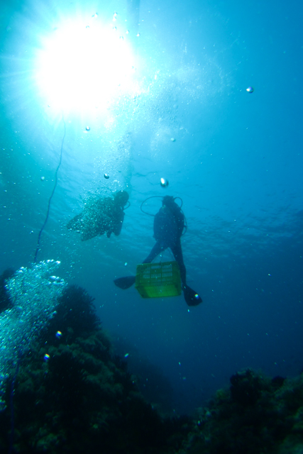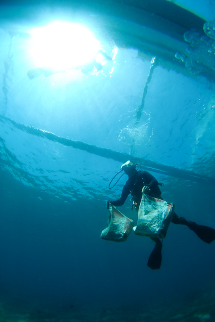 - Diver assigned to gather them, and put into sacks. オニヒトデを書き出して集めるダイバー、袋に詰めて運ぶダイバー。
