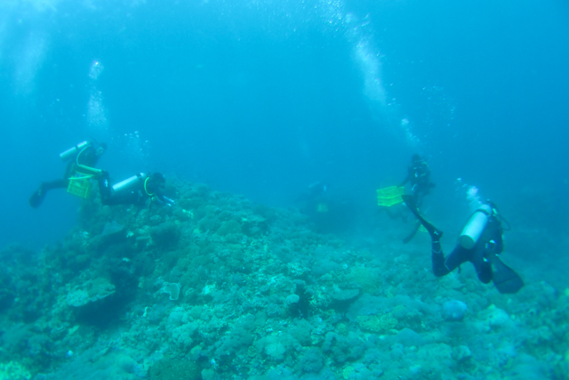 2015年4月27日のダイビングで発覚した、グロットポイントの多数のオニヒトデ。アニラオエリアで最もサンゴの残るこのエリアのサンゴを守るため、第一回の捕獲ボランティアミッションを行いました。