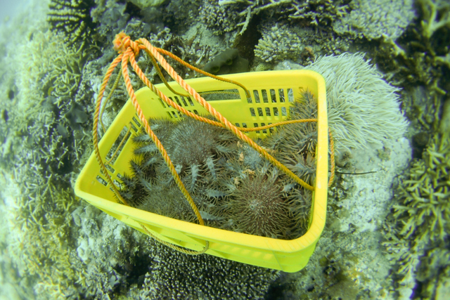 - Each basket can carry 15 to 20 crown of thorn. クレート一つでオニヒトデ15から20匹。