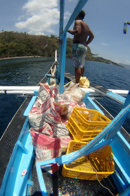 ・50個程度のサックを持って入り、一人1サックにオニヒトデを詰め、水中の集積所にためたものを、ランナーダイバーがボート下に運び、フックの付いたロープでボートに引き上げる。参加ダイバーが全員フィリピン人職業ダイバーで、刺されることはないといっていたので、この方法を採用。