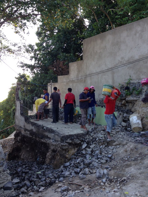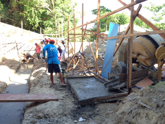 - ミキサーで練ったコンクリートはバケツリレーで運びます。