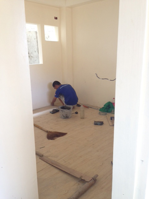 - 新築スタンダードルームの床タイル貼り続行中。