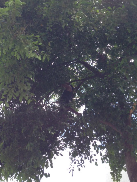 - ガードマンの特技は木登りと枝払い。新しい雨樋に落ち葉と木の実が落ちて詰まるので、はらってもらいました。