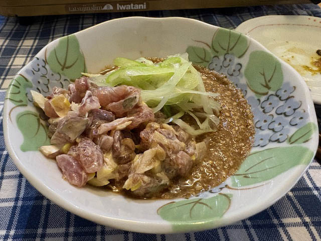 出汁を取った鍋でネギをしゃぶしゃぶして、ごまだれ+アジのたたきをつけて食べるという、たたきを約み扱いする斬新さ。かなり美味しかったです。