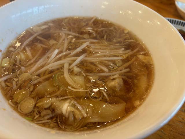 甘じょっぱい醤油系のタレは、小袋ともやしで共通。さらに、ワンタンスープを注文。ワンタン麺もあるのだけれど、ワンタン単品がミソ。いきなりお腹いっぱいになることはないです。もやしがかぶってるけど、気にしないです。このツルリン感、餃子よりワンタンのほうが実は好みかも。