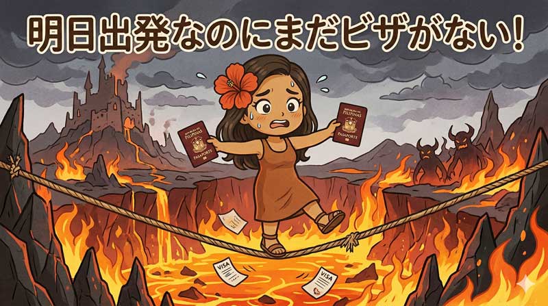 スタッフのジェラルディンとクラリッサが、翌朝9時のフライトで日本へ旅立つ予定なのに、日本のビザがまだない!