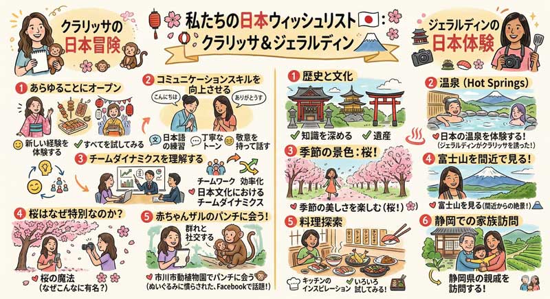 - 温泉:日本の温泉を絶対に体験したい!(そして、クラリッサにも一緒に入るように強く勧めている!)