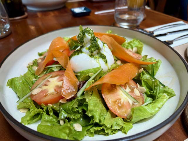サーモンのサラダは4欠片しかサーモンが入っていませんでしたが、ナッツとストロベリードレッシングは合うものだと納得。