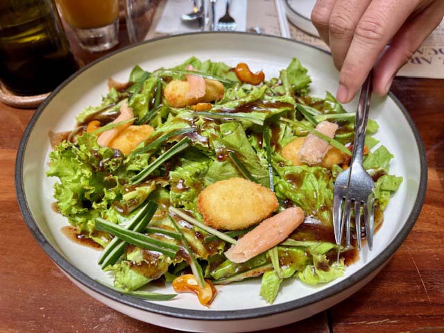 特に印象的だったのが、フルーツとナッツが入ったサラダ。高原野菜に加えて、タガイタイで採れるバラココーヒーを使ったドレッシング。「おっ」と思うお味でした。