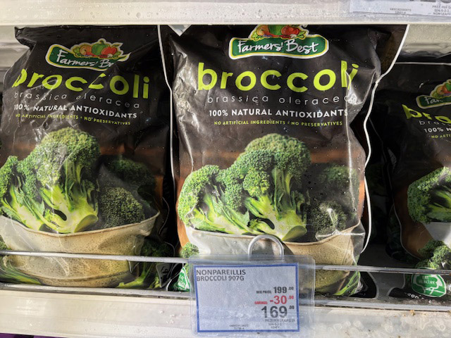 市場で野菜を見て改めて思いましたが、野菜が高いフィリピンにおいては、冷凍野菜のほうが圧倒的に安いです。例えばブロッコリー。今シーズンは安くなったとはいえ、市場では1kgで250ペソ。でも実際は長い茎がついたままなので、可食部が6割くらい(1kg換算で400ペソ超え)。冷凍ブロッコリーは可食部だけで200ペソくらいなので、結果的にかなりお得です。