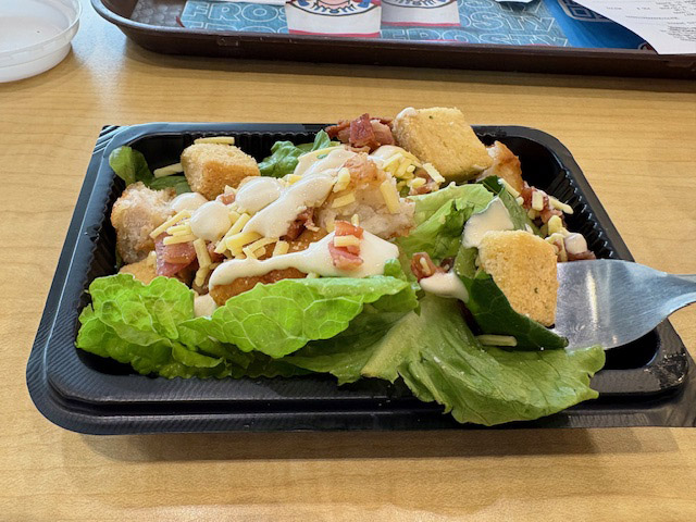 入ったのは病院近くのウェンディーズ。ファストフードはあまり好ましくないですが、他にないので背に腹は代えられません。奥さんはハンバーガー、私は一応サラダにしてみました。シーザーサラダで、チキンが入っています。シーザードレッシングは別添えで、使ったのは5分の1くらい。全部使ったら、アメリカンな体型に近づけそうな危険な分量でした。