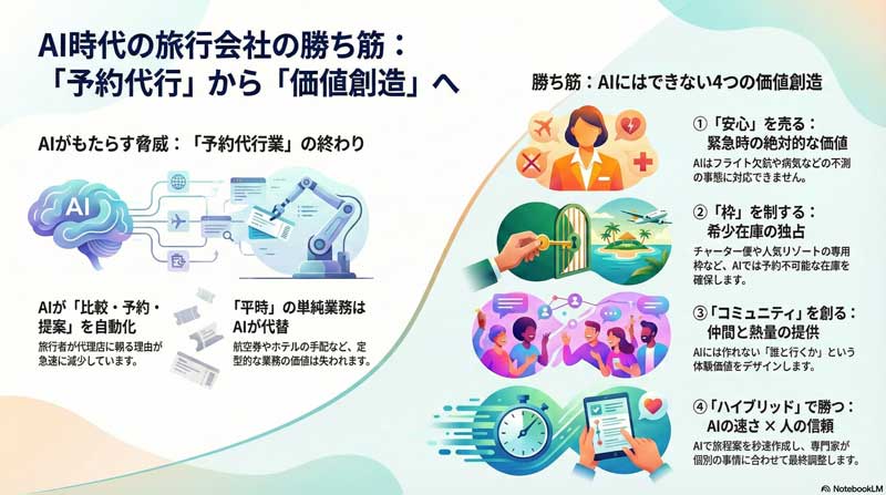 自分で旅行に行くときも、ほぼほぼ旅行代理店は使わなくなっているのはインターネットの普及のせい。さらにこれから検討と予約までしてくれそうな AI のエージェント機能が強力になってくることを考えると、旅行代理店の将来が不安になります。
