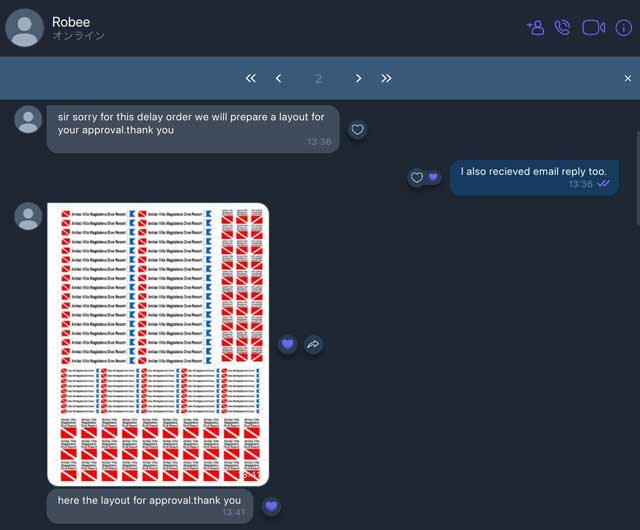 スマホの連絡先に登録すると、Viberでメッセージを送信できるようになります。Name Sticker for divingをオーダーしたいといえば通じます。