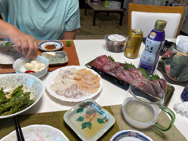 あちこちで歩いて、更に外に食べに行くのはつかれるので、角上魚類で買ってきたお刺身で夕食。
