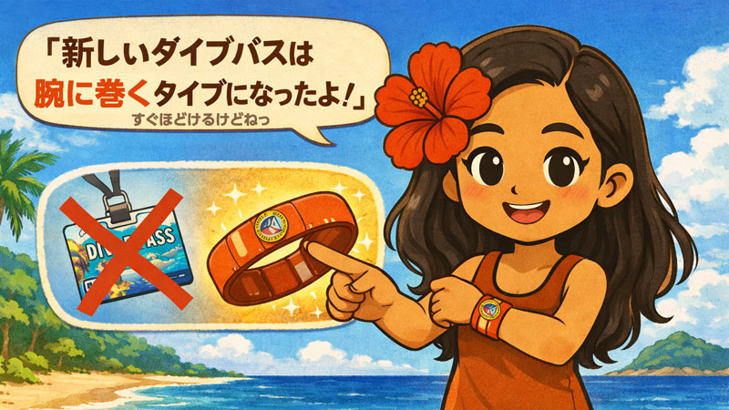 それを受けてなのか、今年のマビニのダイブパスは、去年まで厚紙のチケットだったのが、なぜか腕に巻くタイプになりました。しかも薄いプラスチック製。水で溶けないのはいいんでしょうけど、とにかくむっちゃほどける。