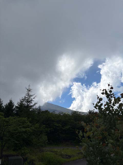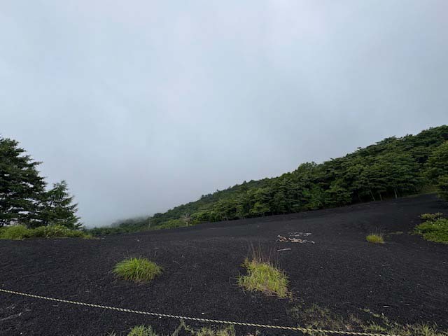 道中は雨が降りそうな空模様でしたが、無事に到着。自衛隊の大きな演習場の横を通る無料道路を抜け、火山灰の黒い地面が広がる駐車場に着きました。標高はおよそ2300m、気温は涼しい16度。下界では30度を超えていたので、火山灰の地表と相まってまるで別世界でした。