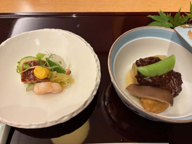 夕食の会席料理は本当に素晴らしかったです。手間暇かかった一品一品に「はー、ほー」と感動。特に、普段苦手な梅も「青梅の甘露煮」として出てきて、初めて美味しくいただけました。お父さんのお供えに使った静岡産のマスクメロンや、イチゴムースなどのデザートも最高。