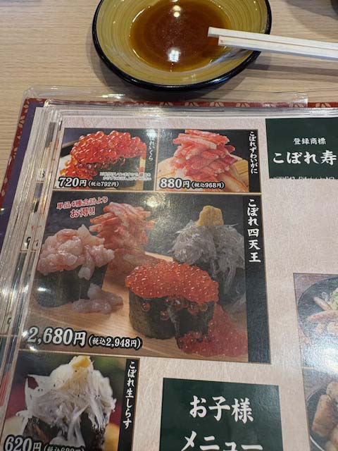 ひとつひとつ注文するよりも、「こぼれ四天王」(税込み2,948円)的なセットで頼んだ方がコスパが良いということも発見。隣の外国人のお母さんが最初から注文していたやつです。