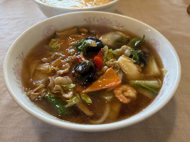 埼玉県の飯能市で有名な町中華で、平日でもたいてい行列のできる人気店、西華苑。ラーメンやチャーハンが評判で、辛酸っぱいスーラータンメンが名物らしいのですが、唐辛子アレルギー疑惑の晴れない私は「五目ラーメン」と半チャーハンを注文。