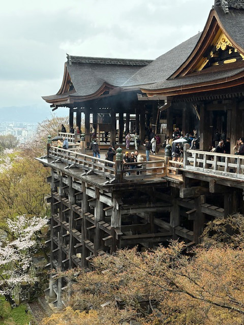あいにくの曇り空でしたが、他の外国人観光客に混じって清水の舞台へ。江戸時代には清水の舞台から願掛けで本当に飛び降りる人もいたらしい。234人が試みて死亡率は15%ほど――つまり85%は生き延びたとか。13メートルの高さ、なかなか度胸がいりますね。