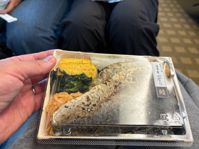 長距離電車といえば駅弁。スタッフたちもそれぞれ好きなものを選んでいました。私はのり弁屋さんの、海苔の上にサバが乗ったもの。青魚を選んでしまうあたり、まだまだ腸活は諦めていませんよ、ということで。日本の駅弁って本当に素晴らしくて、和洋中、健康志向から地元グルメまで、好みや体調に合わせて選べる幅の広さは世界に誇れる文化だと思います。