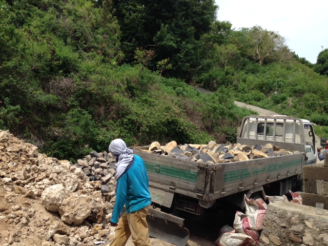 - 道路壁用の岩到着。全部人力で運びます。