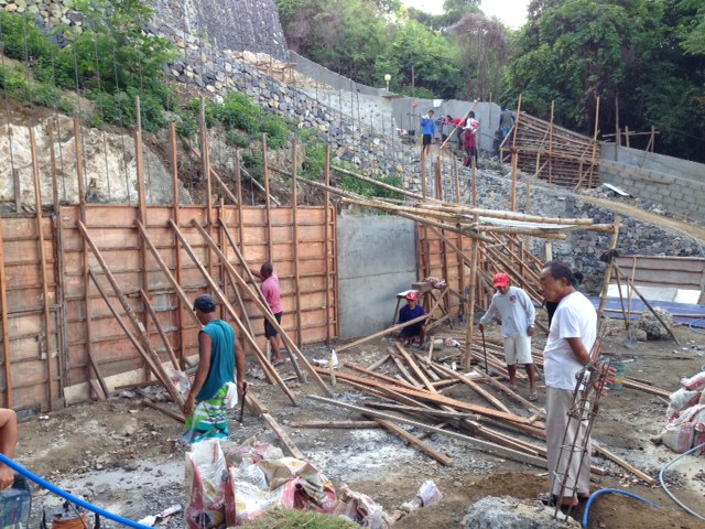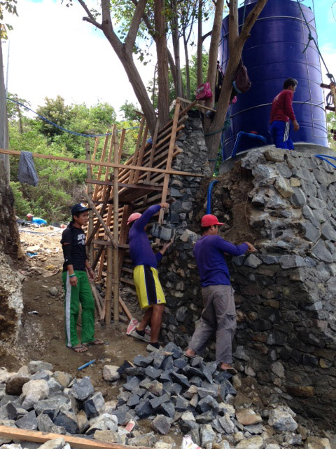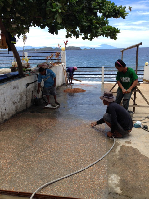 - ダイブショップ前、小石混じりのセメント、最後の一列に着手。